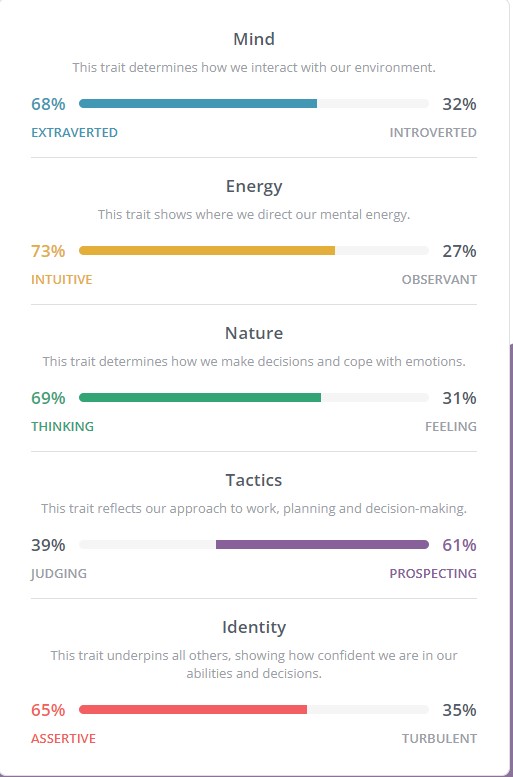 | Extraversion | Reserved • formal • serious • quiet • prefers working alone • avoids direct leadership roles | 67 | Middle | Outgoing • friendly • assertive • likes working with others • enjoys direct leadership roles |