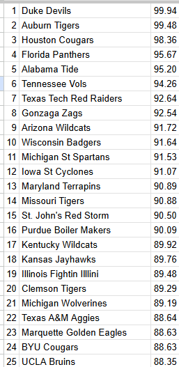 Sports, Take The Points College Basketball Power Ratings (3-1-25) Here are the composite power ratings for the top 25 college basketball teams, as of the morning of March 1. Ratings are an average of five different computer and pro bettor systems. These are spread-based ratings. Share this: Click to share on X (Opens in new window) X Click to share on Facebook (Opens in new window) Facebook Like Loading... Related